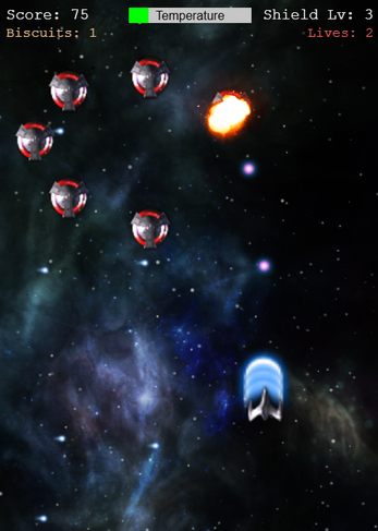 This is a space shooter game where the player has a mission to collect the maximum numbers of alien devices, called "biscuits" for their circular shape. The problem is that when the player has 1 or more biscuits, is immediately attacked by enemies and also, more biscuits (which irradiate a lot of energy) and more the temperature of the ship raises quickly (from this came the idea for the name). There will be items to reduce the temperature in the game provided when a complete formation of enemies is destroyed.